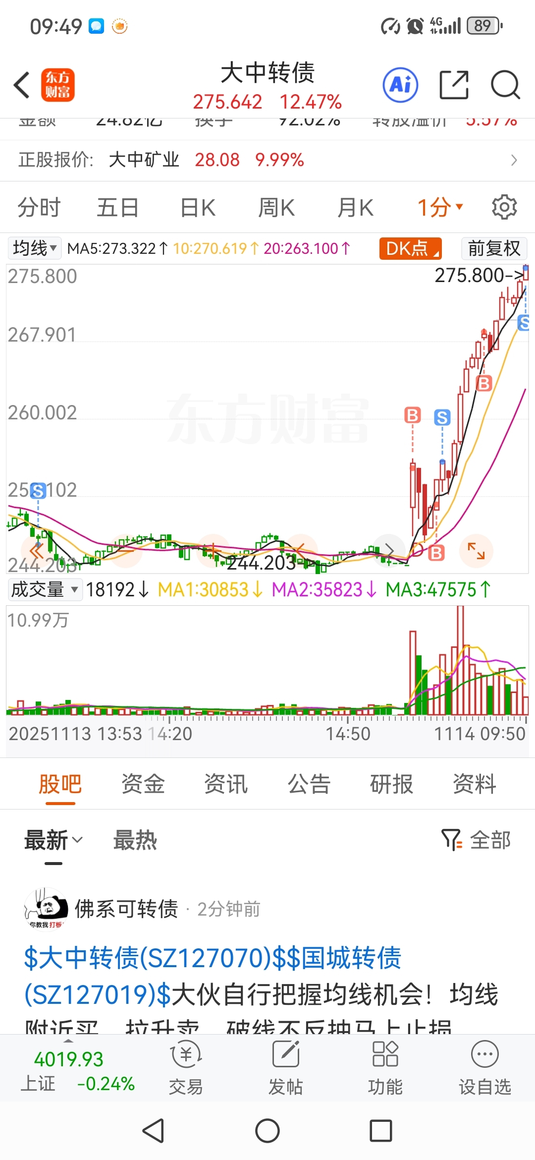 $大中转债(SZ127070)$ 275卖出