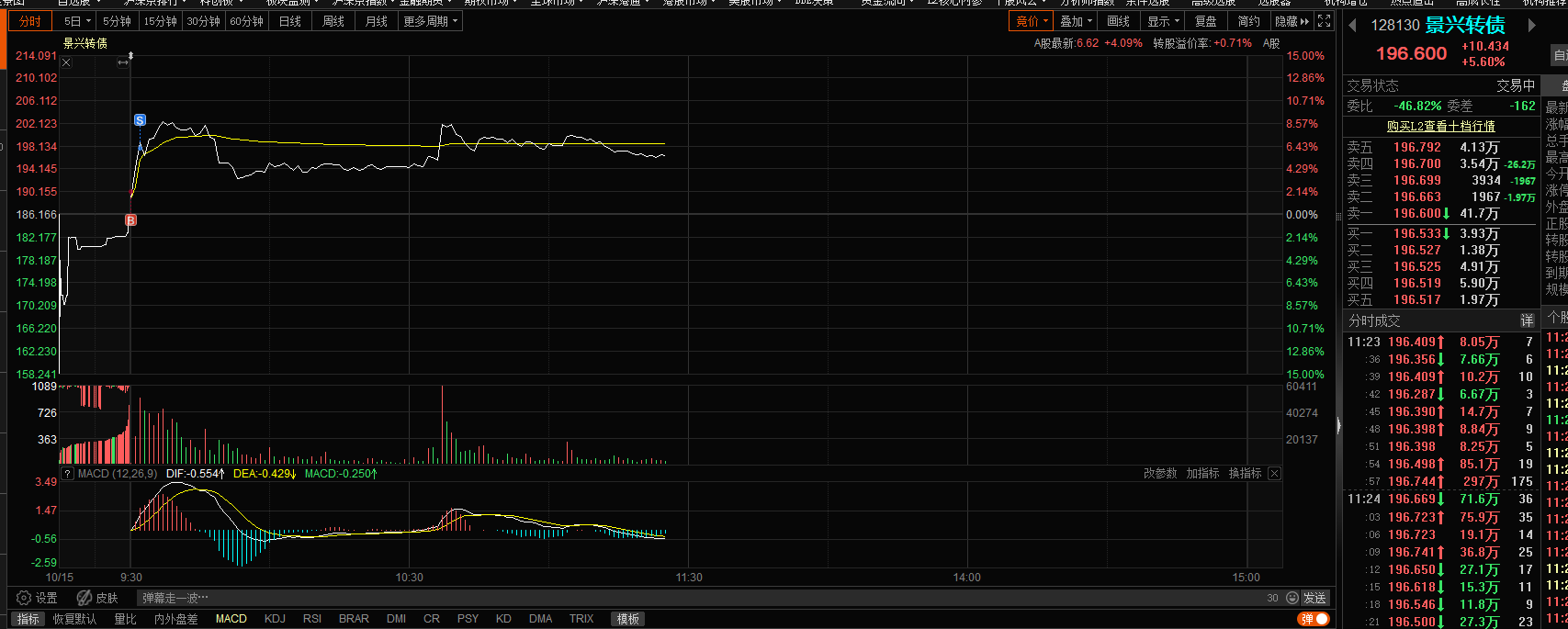 景兴支撑位189附近,早盘资金活跃,10月17日景兴转债最后交易日,15日余额1.227亿,一般来说下午要杀溢价,可在最后半个小时再次择机介入。仅供参考