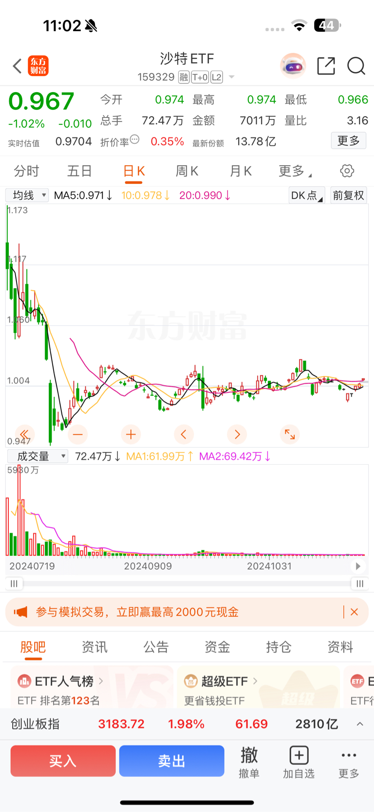 $巴西ETF(SZ159100)$ 沙特当初刚开盘第一天涨停没走的,后面天天跌真可怕今天不清空明天不知道怎么哭