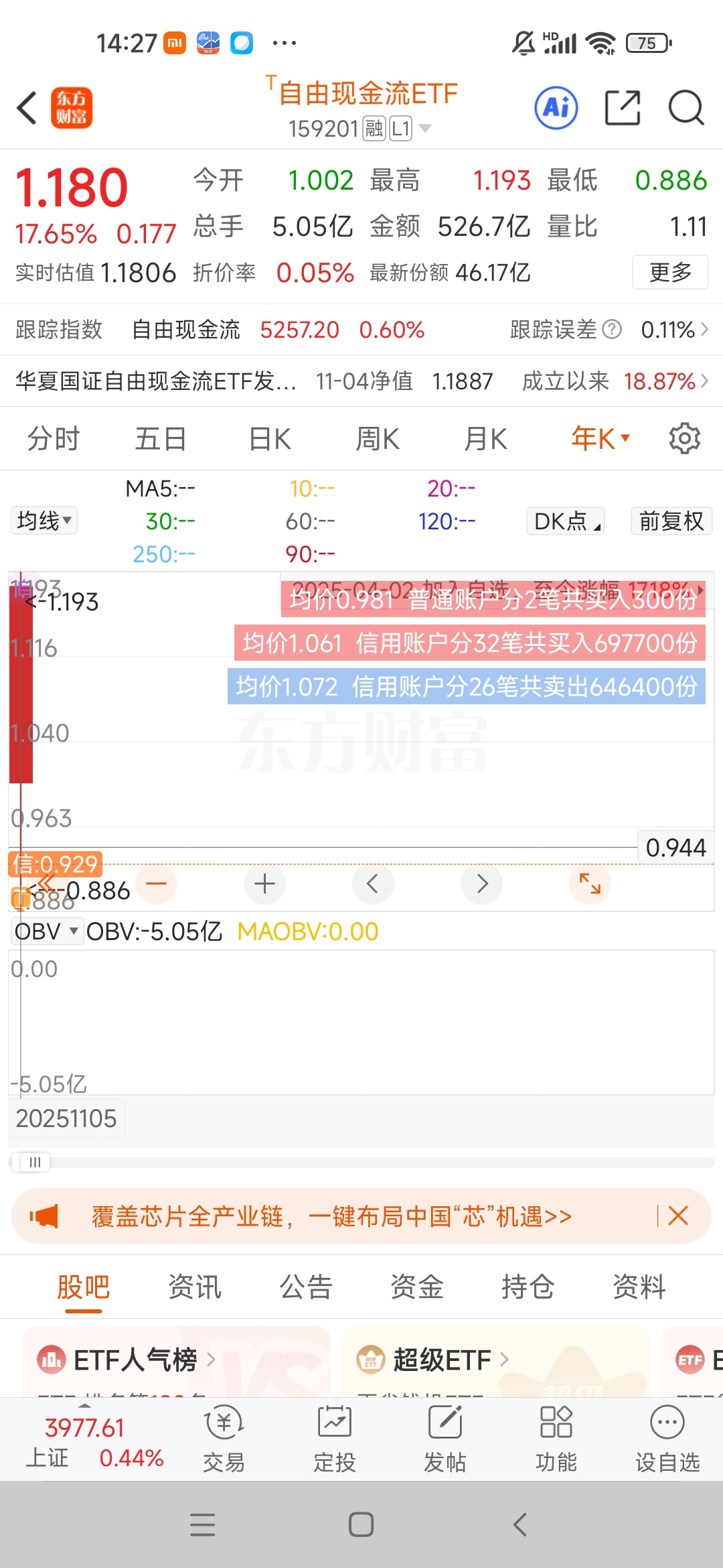 $自由现金流ETF(SZ159201)$ 不段做T把成本降下来,底仓不动