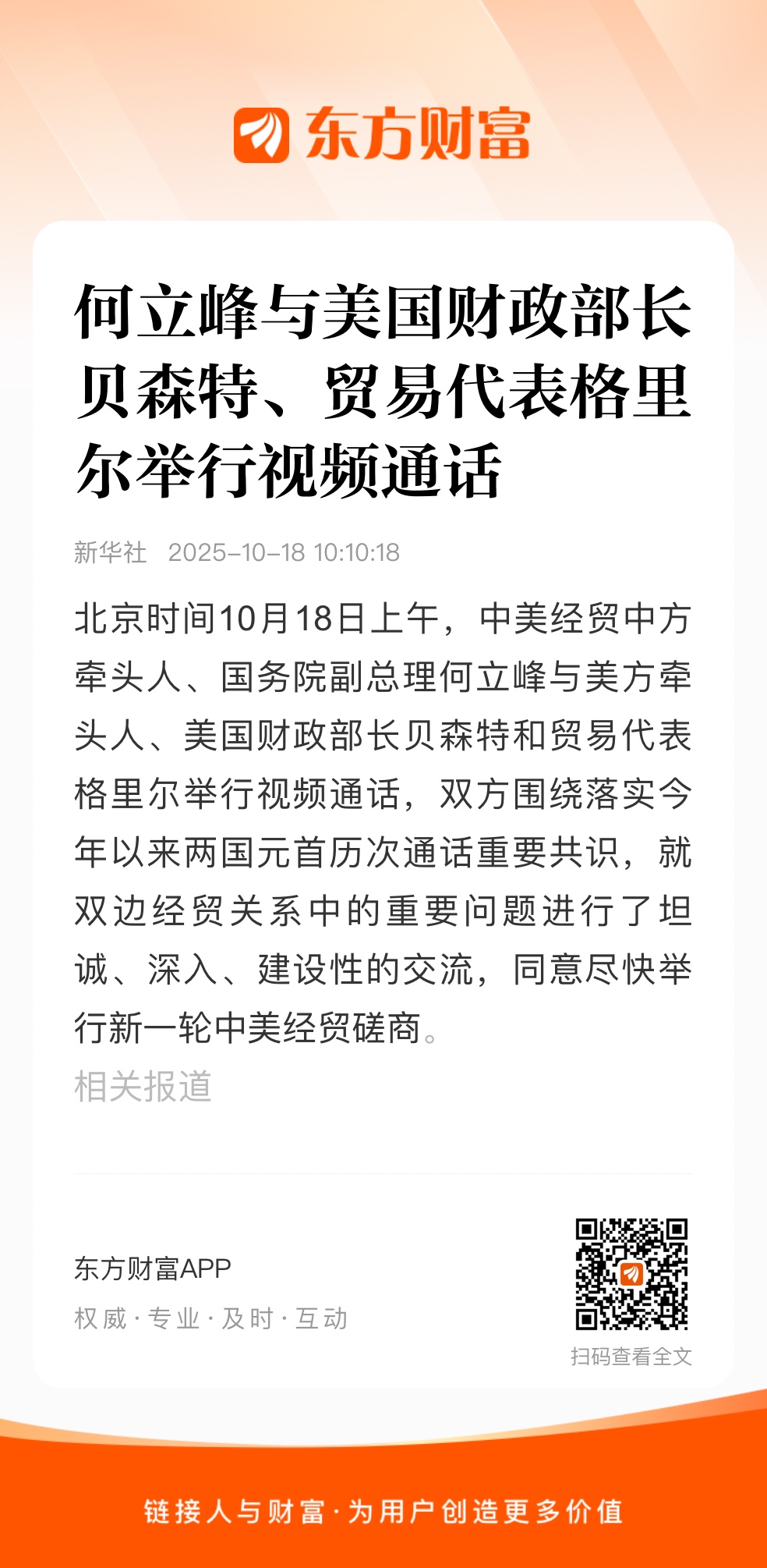 $恒生互联网科技ETF(SZ159202)$ 北京时间10月18日上午,中美经贸中方牵头人、国务院副总理何立峰与美方牵头人、美国财政部长贝森特和贸易代表格里尔举行视频通话,双方围绕落实今年以来两国元首历次通话重要共识,就双边经贸关系中的重要问题进行了坦诚、深入、建设性的交流,同意尽快举行新一轮中美经贸磋商