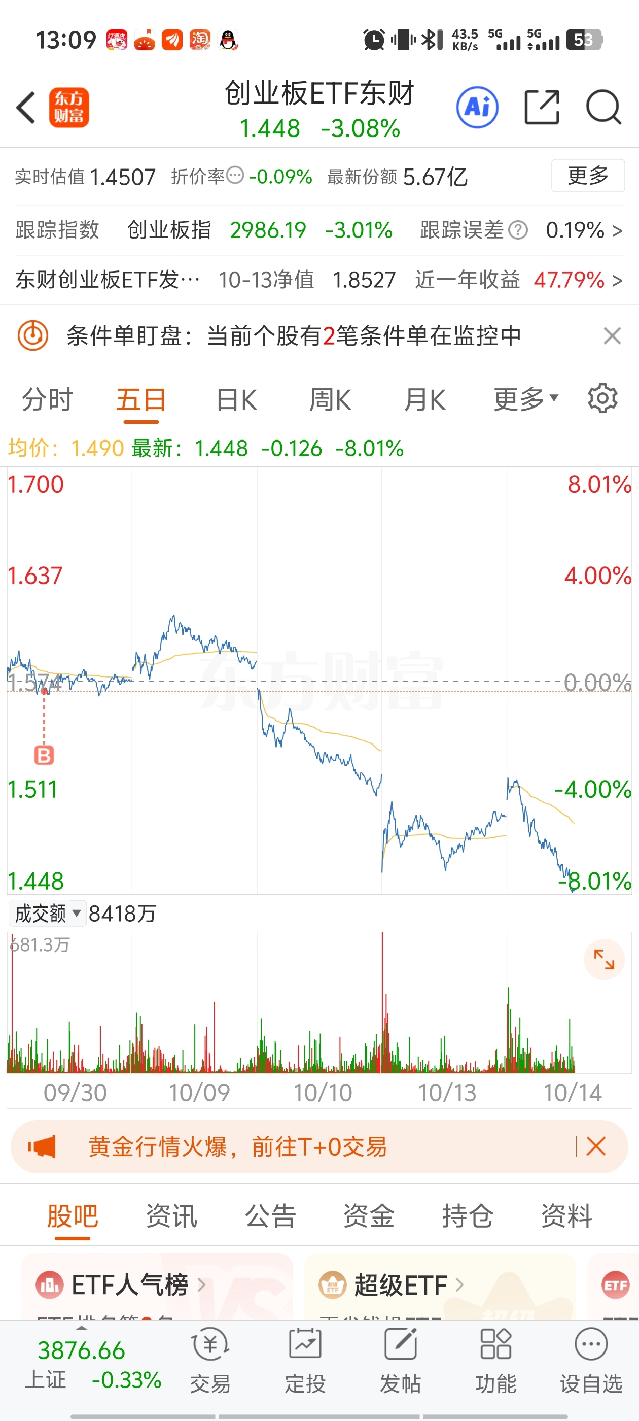 $创业板ETF东财(SZ159205)$ 今日这票看来还是不稳的,以昨日来看,今日小涨的话,可能还能稳定,今日还是持续下跌,和前两天一样,照这个趋势上看,明儿估计跳低。短期看来回本了是不可能了