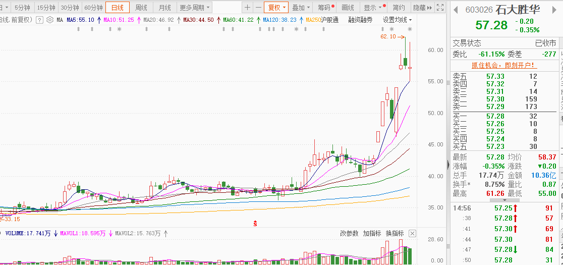 石大胜华:电池,今天低开震荡横盘,偏弱,收十字星,股价在5均线上方没有跌破,上涨趋势延续,看周五能否支撑企稳反包。