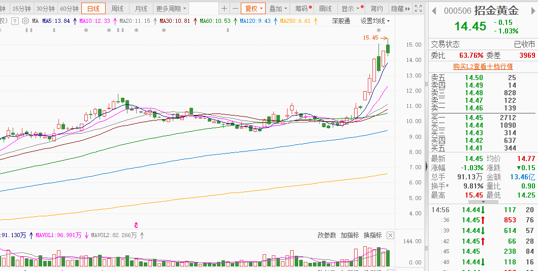 招金黄金:黄金概念贵金属,该股今天震荡横盘收阴线,但均线依然向上运行多头趋势,5均线也没有跌破,上涨延续,该股还有继续向上冲锋可能,先观察等待周五能否反包。