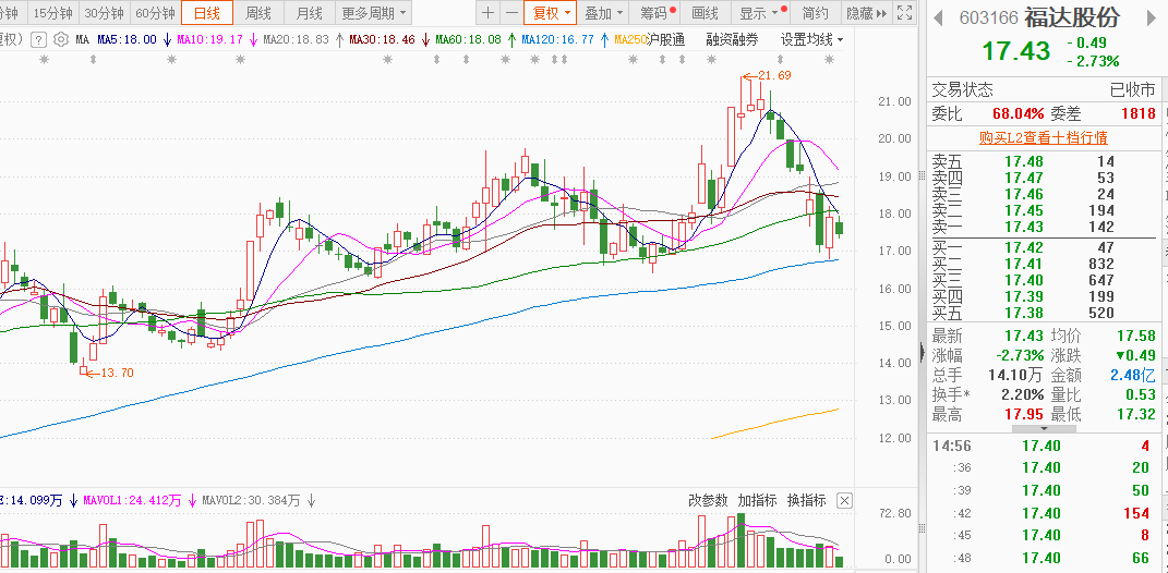 福达股份:人形机器人+汽车零部件。今天被5均线压制回落,虽然跌幅不大,但再次说明空方力量比较强势,120的半年线支撑附近近期企稳不跌破可以先等等。