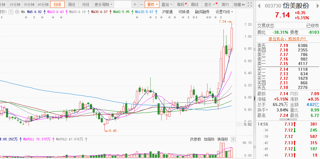 岱美股份:汽车零部件,今天平开震荡反弹,高位震荡,该标我近期反复强调5均线趋势附近先埋伏,今天爆发后收涨5%左右,恭喜。继续格居。