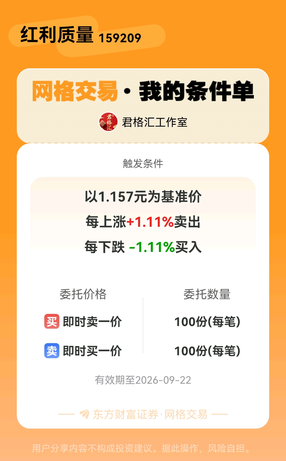 #条件单交流# #网格交易晒单# 一位股神设置了一个网格交易条件单,接下来就是见证奇迹的时刻~$红利质量(SZ159209)$
