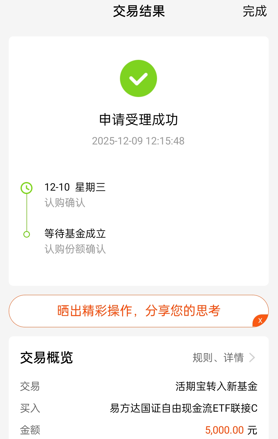 $易方达国证自由现金流ETF联接A(OTCFUND|024566)$ $易方达国证自由现金流ETF联接C(OTCFUND|024567)$正成立中,有基金账户也能参与了。管理费率0.15%/年,托管费率0.05%/年,合计0.20%,显著低于同类Smart Beta产品 。建仓5000元的。