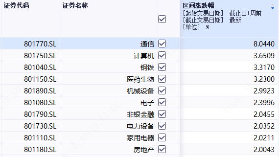 指数走势上,由于前期大金融的走强,以及”反内卷“带动顺周期的修复,整体科技板块表现相对一般,但这正好对前期涨幅较大实现了较好的消化,A股行业轮动,近一周通信、计算机等科技细分领域涨幅就在前。