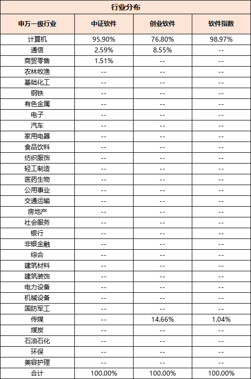 相较于其他软件指数,创业板软件指数在计算机行业的集中度并没有达到惊人的95%以上,它在传媒、通信都有适度分布。
