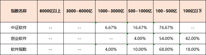 成分股流通市值分布上,创业板软件指数低于100亿的个数占比达42%(中证软件、软件指数分别为0%、18%),小盘风格更加凸显。
