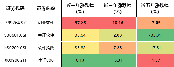 历史表现显示,创业板软件指数2018年以来年化收益率为4.08%,近一年、近三年及近五年涨幅分别为37.85%、10.16%及-7.05%,高于当前其它可投指数。