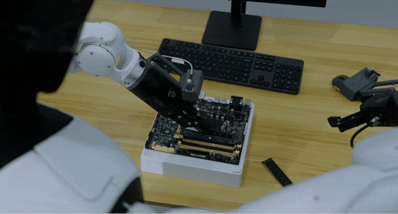在精密操作场景中,精灵G2使用高精度力控臂,基于真机强化学习算法,仅耗时一小时即可学会内存条插接这类精密且柔性的操作任务。
