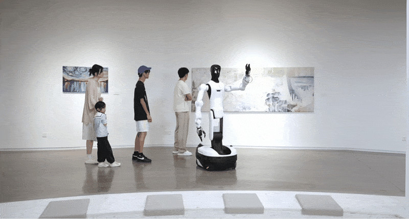 G2可以应用于商业导览场景,循序渐进引导观众参展,周身传感器使其具备全向感知和危险预判能力,遇到特殊情况(比如有人挡住道路时),能自主进行灵活调整。