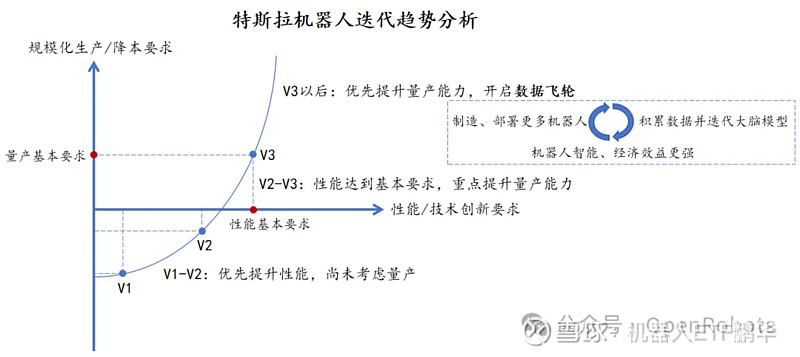 此外,量产前和量产后的产品迭代演化趋势可能是截然不同的:量产前以提升性能使机器人达到性能要求为优先,而量产则说明当前硬件方案已经满足基本性能要求,未来将优先提升量产、降本能力,从而推广产品、开启数据飞轮。