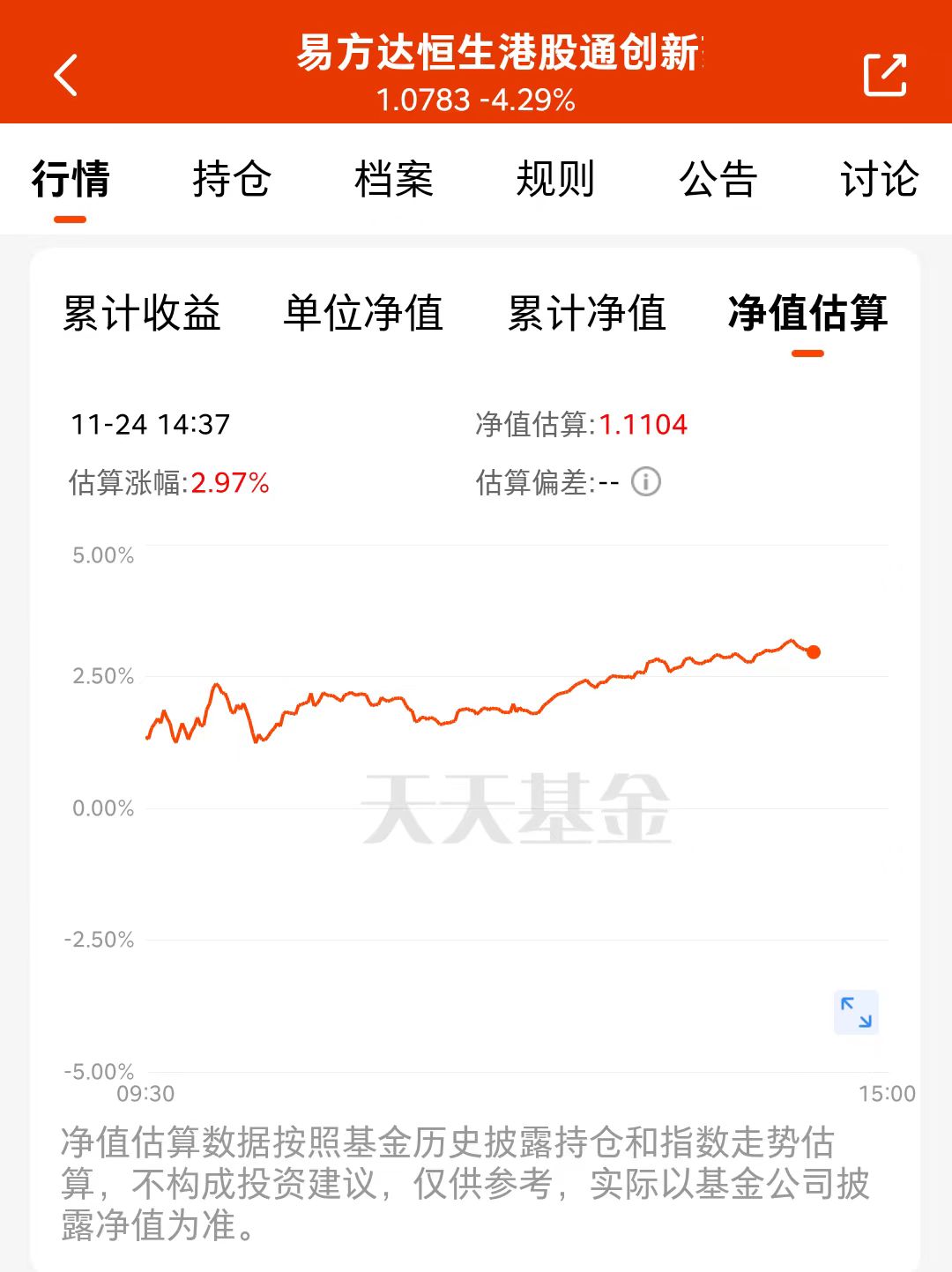 今天股市行情震荡反弹,大盘指数集体拉升,创新药板块反弹上涨,其实从三季度多家创新药企业绩来看,创新药行业从研发期迈入商业化收获期,产业趋势没有结束,有机会就不能错过,我关注的是易方达恒生港股通创新药ETF联接发起式C,今天估值快涨超3个点了,反弹能力强