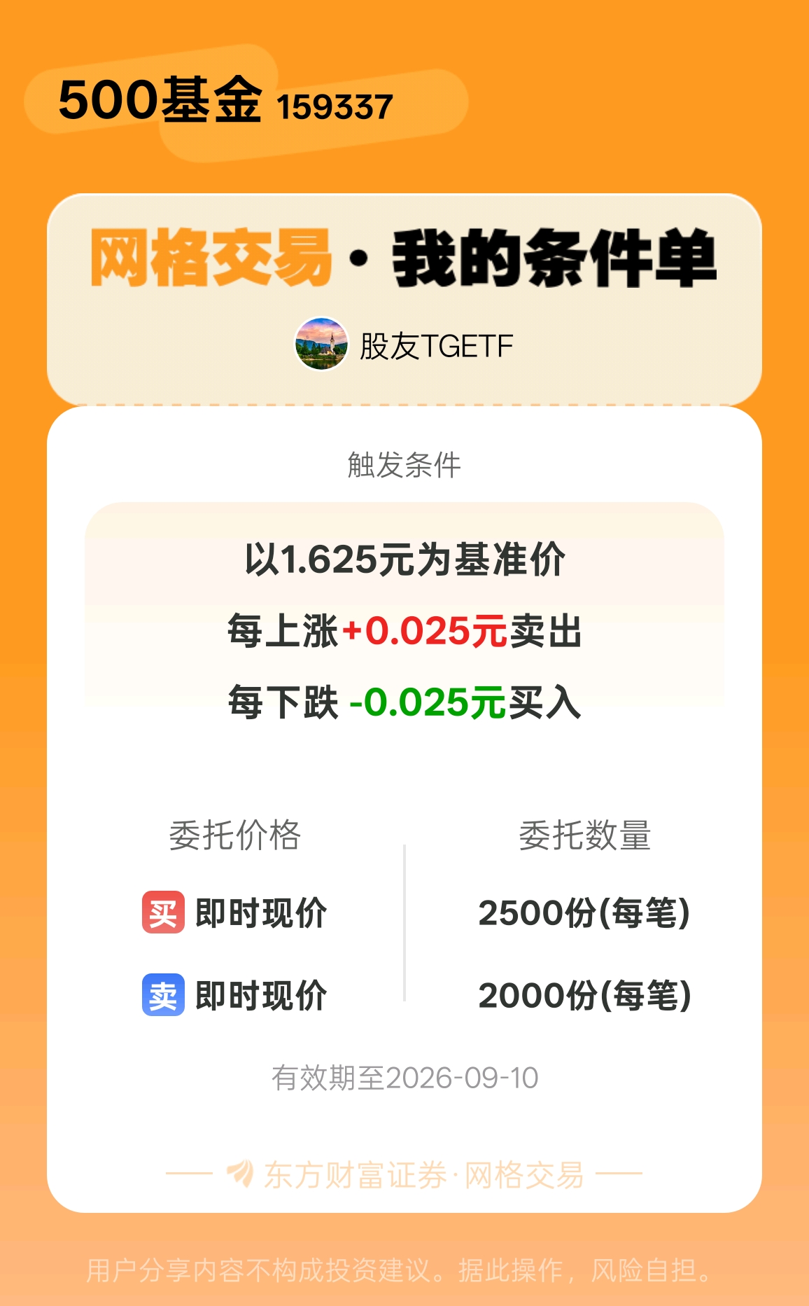 #条件单交流# #网格交易晒单# 一位股神设置了一个网格交易条件单,接下来就是见证奇迹的时刻~$500基金(SZ159337)$