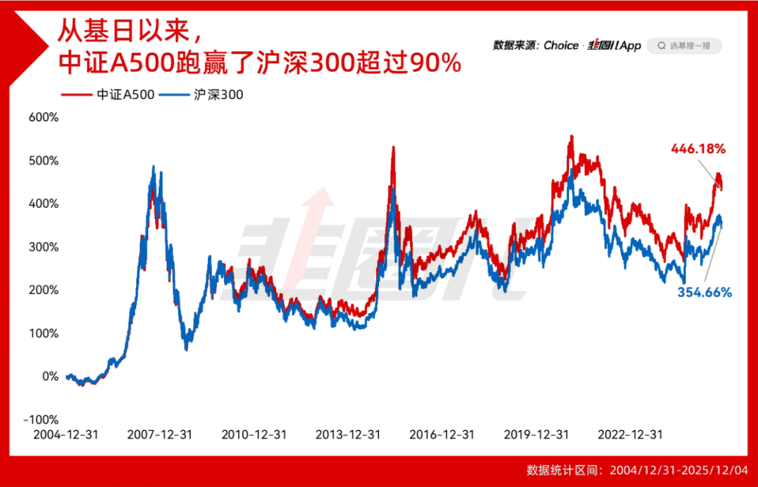 去年咱们说,中证A500是沪深300的增强,从长期的效果看,增强的效果固然是非常显著。 基日(2004年12月31日)以来,中证A500的收益超过沪深300超过90%。
