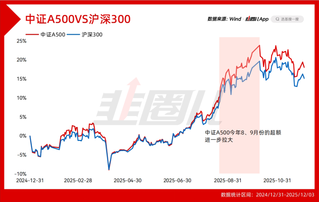 而看年内数据的话,截至12月3日,中证A500的年内收益是18.04%,沪深300是15.15%,多出来将近3%的超额。