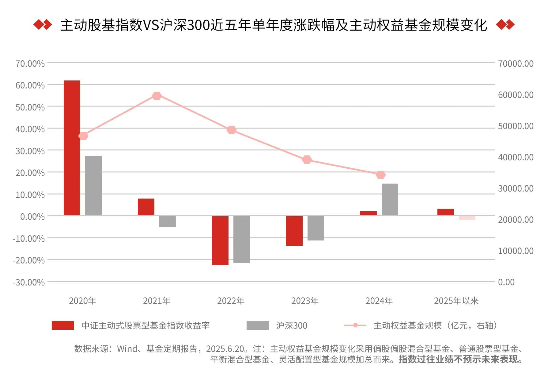 2022-2024年,主动权益基金经历了一场深刻的“压力测试”,以中证主动式股票型基金指数为例,连续三年跑输了宽基指数,主动权益基金的管理规模也持续缩水。但2025年开年以来,股市交易情绪高涨,截止2025年6月20日,主动股基指数涨幅已超越沪深300指数5.82%,随着业绩的回暖,主动权益的春天或正在悄然来临。