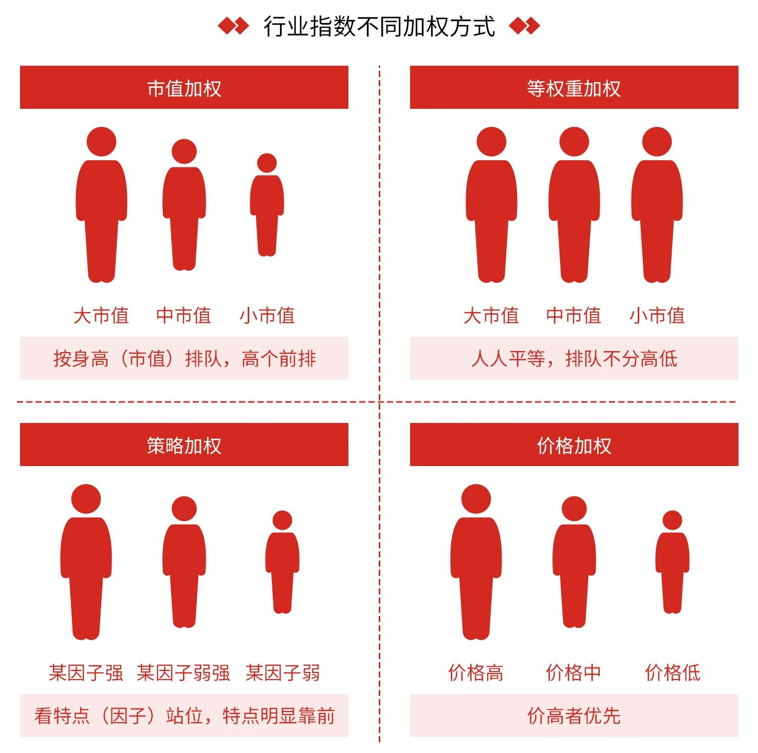 行业不同指数在进行市值加权时也可能会选择不一样的方式,主要为普通市值加权、等权重加权、策略加权、和价格加权四类。
