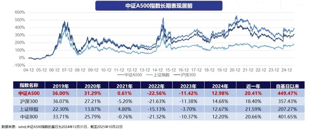 从过往中长期表现来看,自2004年底基日以来至2025年10月22日,中证A500指数累计上涨449.47%,显著跑赢上证指数和沪深300指数,呈现出“牛市跑赢、熊市跑平”的特征。