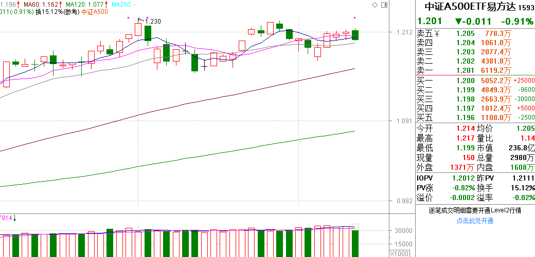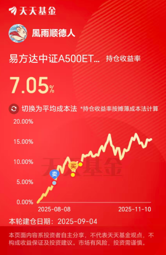 就像今天这样,那怕是指数出现回调,个股涨跌家数并没有明显拉开,还是1:1的状态,站队能力才是最核心的盈利条件。我看好易方达中证A500ETF联接C,这个品种跟踪的是中证A500指数,覆盖过去几年ROE中位数和净利润复合增长率每年均显著高于市场平均的上市公司,没有刻意的进行风格筛选,正是电风扇行情的克星!易方达中证A500脱离了存量博弈左手交右手的玩法,始终以业绩为驱动因素,持有时间越长,收益就越大。比如我有9月4号建仓,随后继续加大投入,两个月收益就有7.05%,虽然比不上主线题材,但不用动脑子,躺平就行了,这不比拿着债券基金好吗?趁着市场还没有正式走强,还得珍惜每一次倒车接人的机会啊。