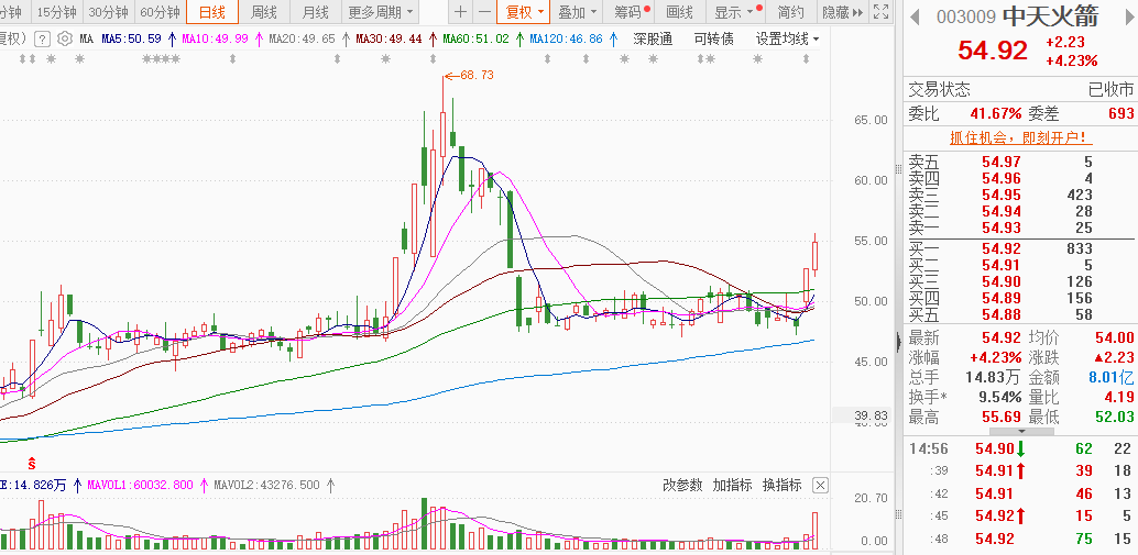 中天火箭:航天概念。该股长期在46-51附近区间震荡筑底,蓄力完成后上周五开始涨停突破60均线和筑底上轨道压力,均线粘合开始向上走拉升,处于拉升初期,另外周一继续向上爆发,连阳上冲,向上的趋势已经形成,距离前高压力还有很大空间,所以今天可以继续逢低抓。