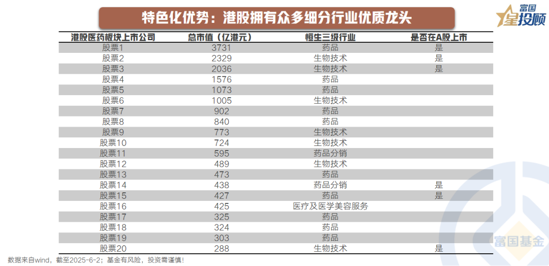 在港上市医药企业中有不少细分行业优质龙头,在全球医药产业格局中占据独特地位,且多数未涉足A股市场。如港股医药板块前二十大市值的上市公司中,仅6家在A股上市,其他仅在港或港美两地上市,形成了港股医药板块独有的特色优势。