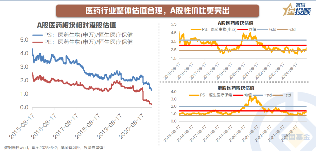 在过去三年经历了药品集采、医保谈判、创新药出海受阻等多重政策冲击,市场对医药板块估值下杀已有充分预期。随着政策风险缓释和海外流动性压力缓解,医药行业尤其是创新药板块估值有望提升。申万医药生物指数PS估值为2.75倍,位于近十年42.47%历史分位;恒生医疗保健指数PS估值为1.35倍,位于近十年65.26%历史分位。A股医药估值虽绝对值高于港股,但历史分位更低,具有较高的估值性价比和安全边际,具备“进可攻、退可守”的特性;港股则需等待创新药叙事突破或海外流动性进一步宽松信号。