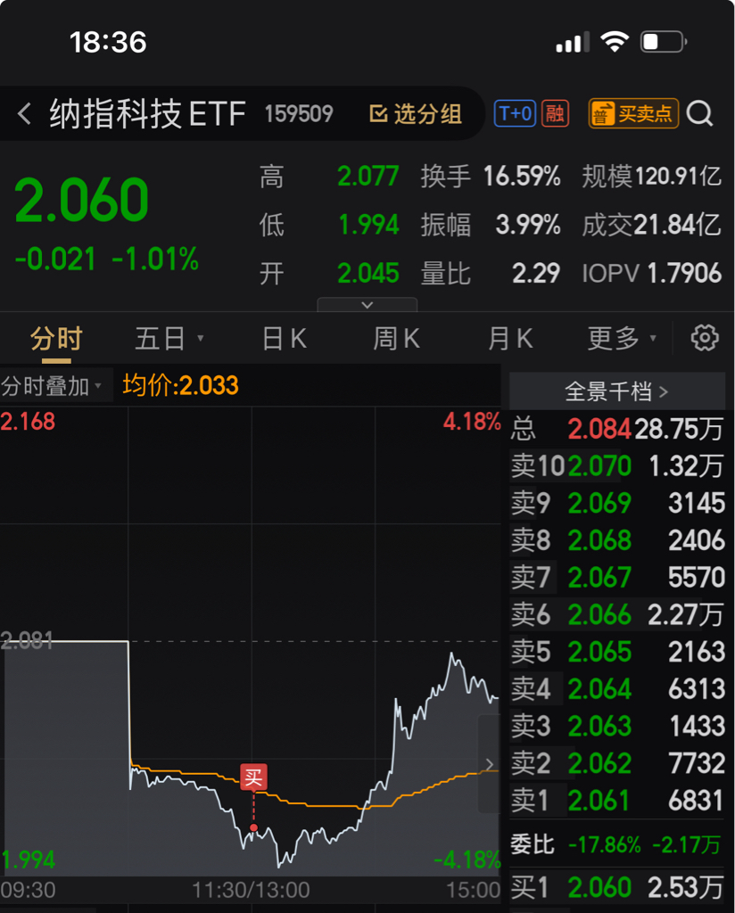 $纳指科技ETF(SZ159509)$ 买不到今天最低点