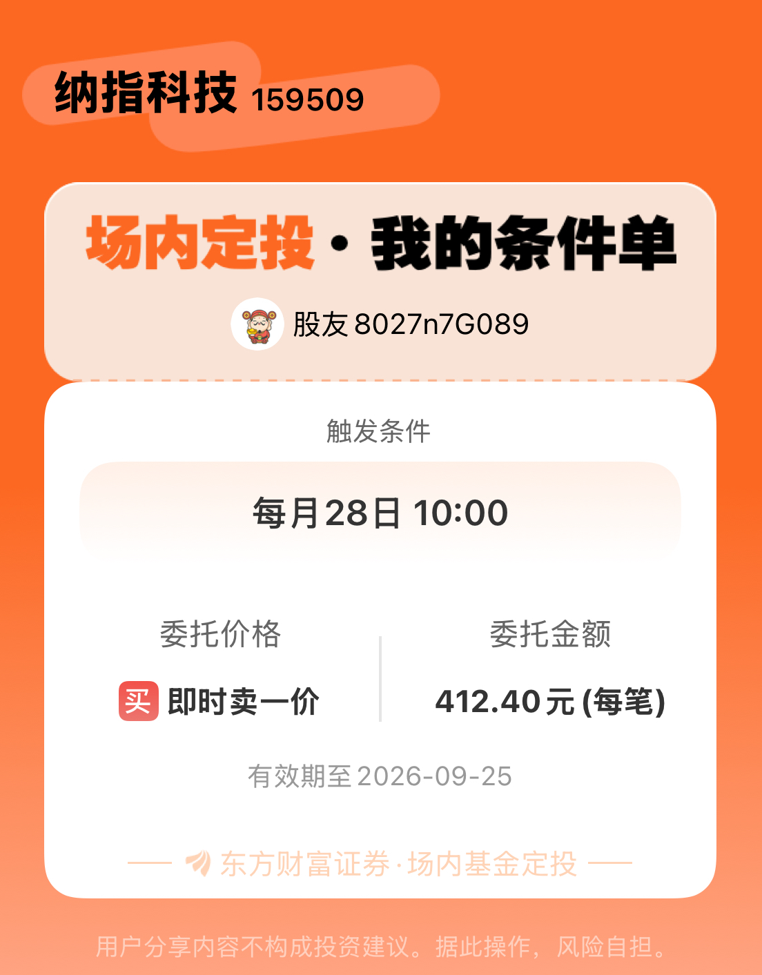 #条件单交流# #场内定投晒单# 一位股神设置了一个场内基金定投条件单,接下来就是见证奇迹的时刻~$纳指科技(SZ159509)$