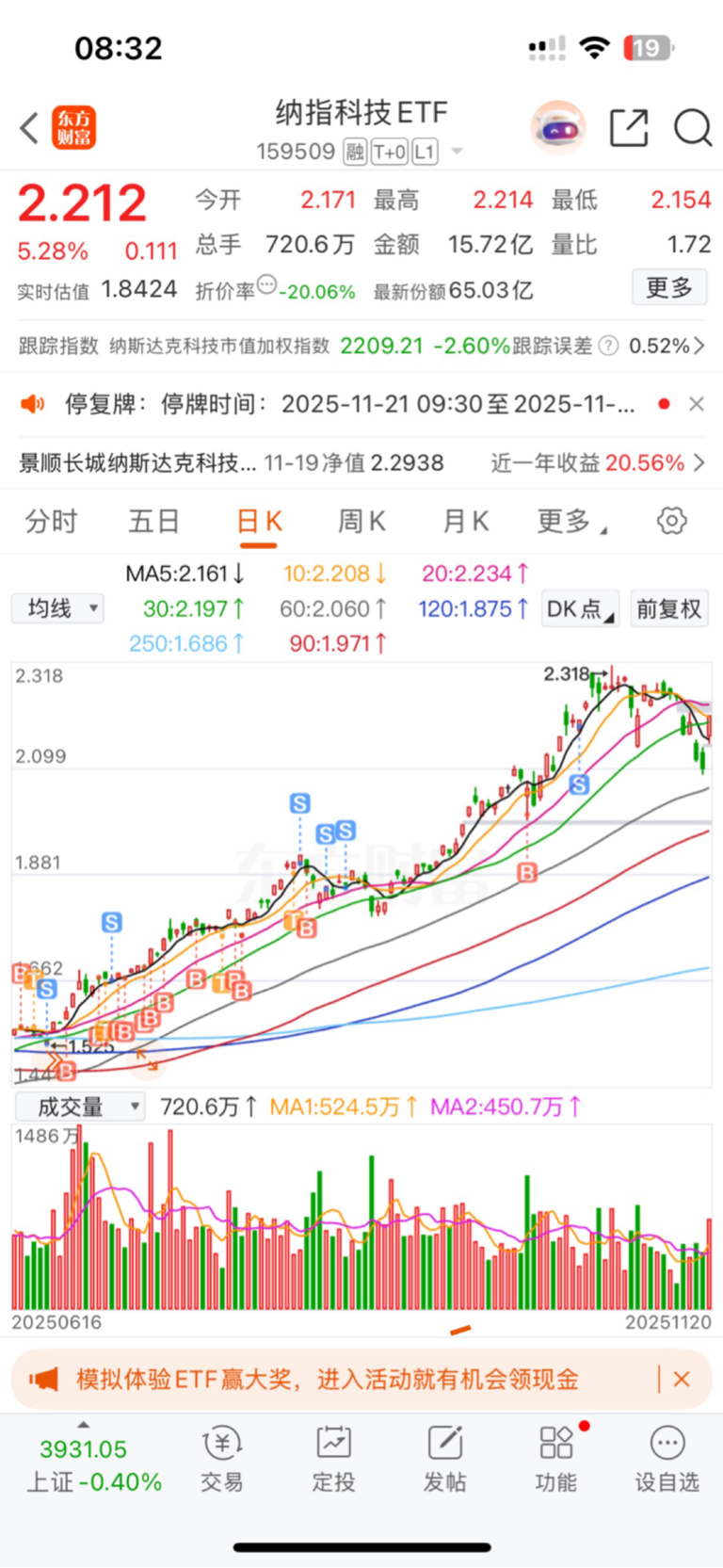 $纳指科技ETF(SZ159509)$ 早上一看纳指我也是傻眼了,财报也救不了趋势,美股已经连续大涨七八个月,再强的市场也会调整,预计美股周线,月线级别调整开启到年初,等着低位切换2026年年线,纳科等着杀溢价吧,去年夏天开始的调整跌怕了,大多数人其实是扛不住的。提前空仓了,宁愿少挣点,溢价不回3以内不买。吧里有很多大佬,当然长远看美股科技肯定依然涨,长线大资金无所谓。