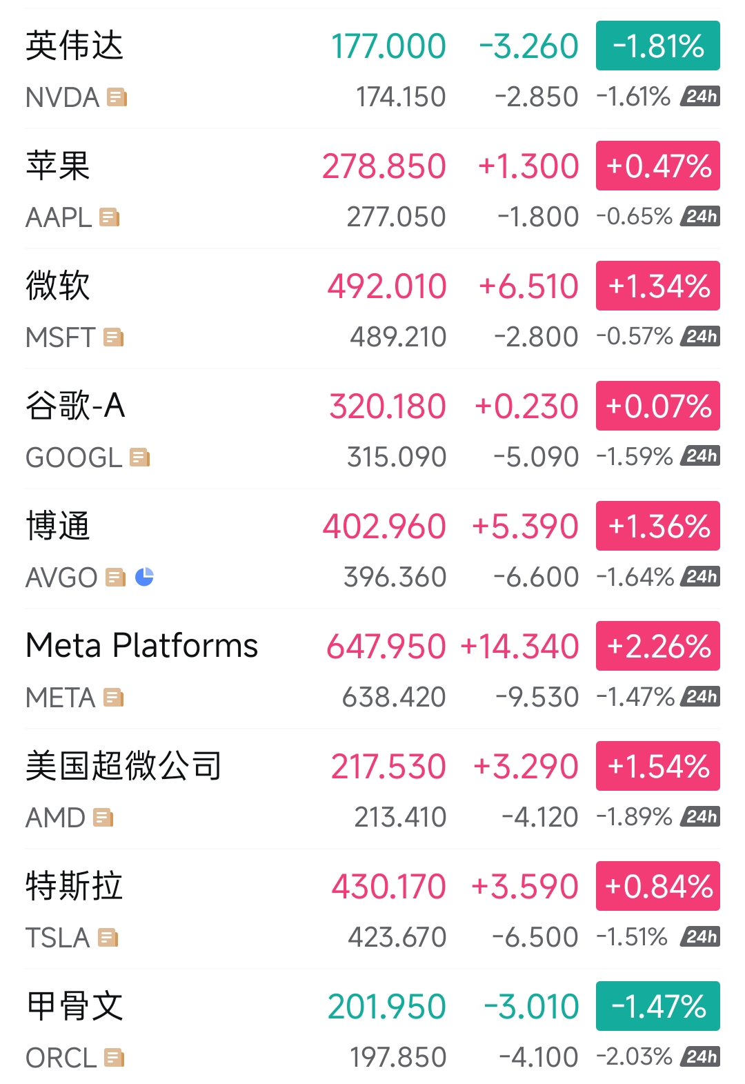 $纳指科技ETF(SZ159509)$ $纳指ETF(SH513100)$ $标普信息科技LOF(SZ161128)$ 截止午间收盘,七姐妹的夜盘实况。