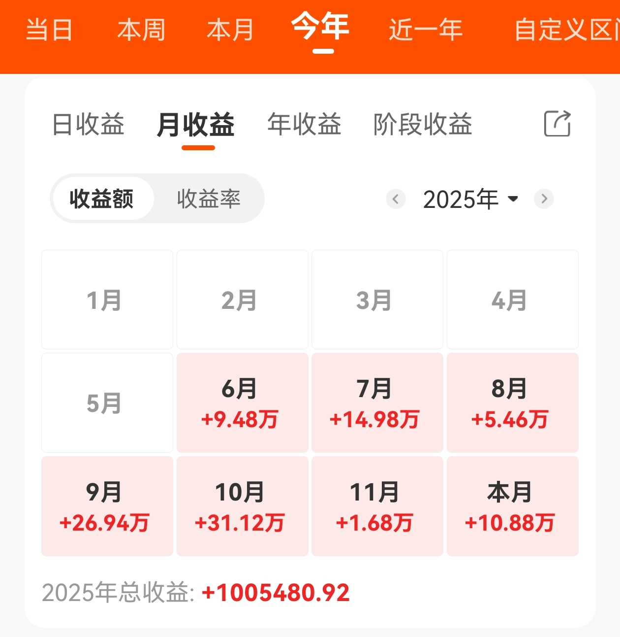 感谢纳指科技,今年收益重新回到100万大关,继续保持每月盈利,自从买入纳指科技,