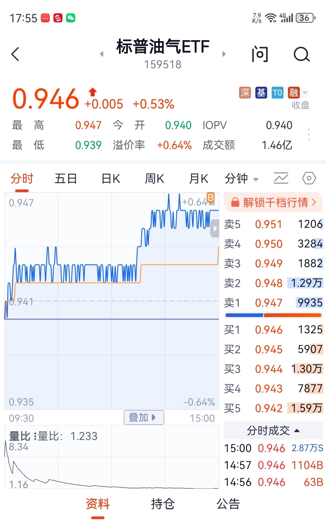 $标普油气ETF(SZ159518)$ 早盘买化工,尾盘买油气。今天尾盘继续加仓标普油气ETF!
