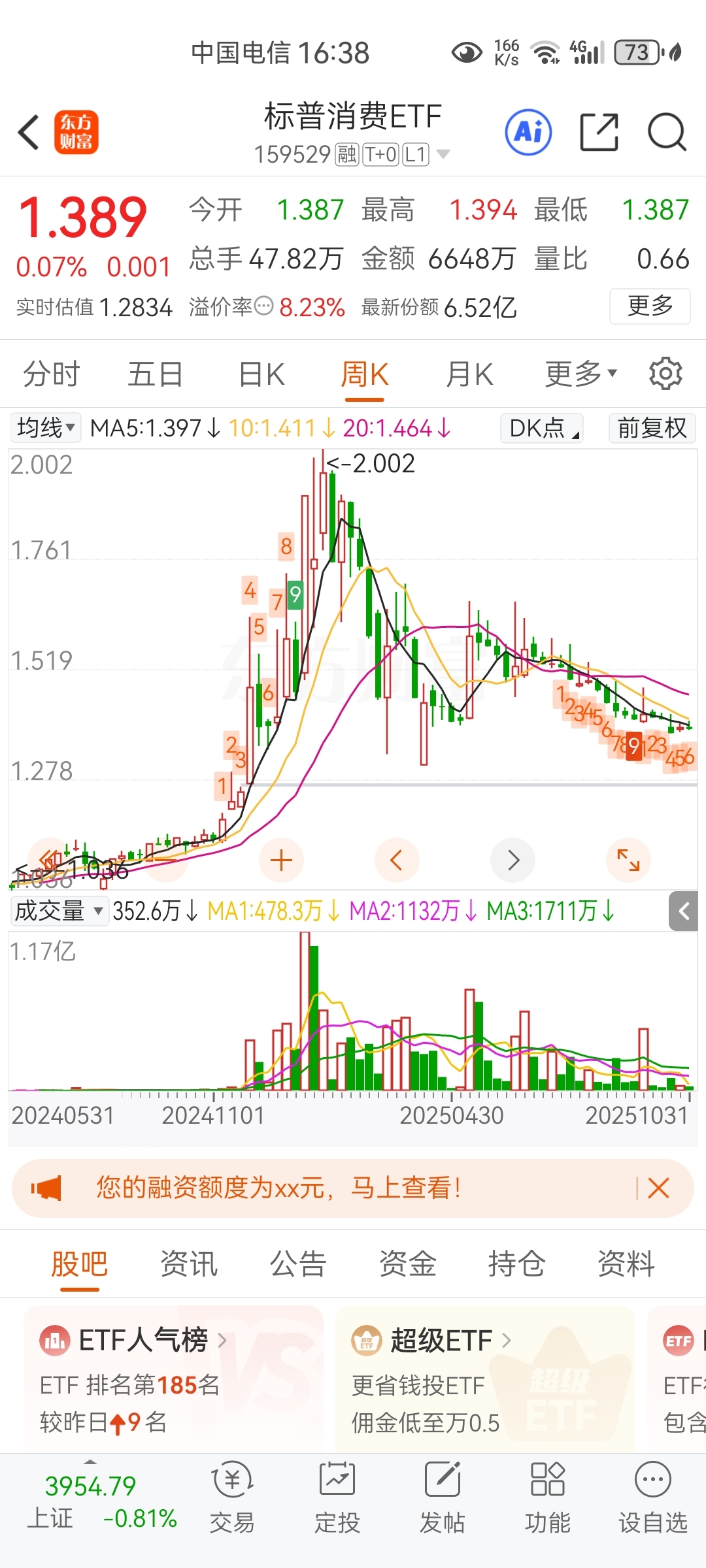 $标普消费ETF(SZ159529)$ 周线还没到低点,不会不月线低9才能进,但是周线又有大量资金进,不敢买