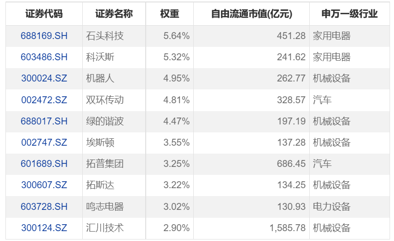 该指数前十大成份股覆盖了人形机器人产业链的核心环节,包括精密制造、核心部件、整机制造等领域,权重集中且质地优良。