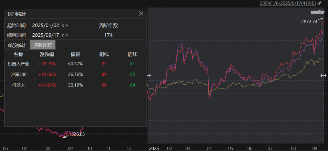 截至2025年9月17日,中证机器人指数上涨41.01%,国证机器人产业指数更是大幅上涨48.29%,显著跑赢沪深300指数33%的涨幅。