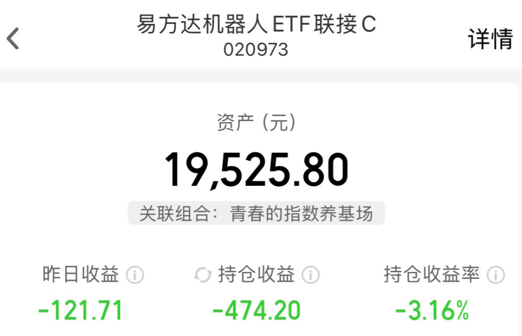 我加仓$易方达机器人ETF联接C(OTCFUND|020973)$5000元!跟踪的国证机器人指数最近连续出现调整,好在昨天回踩临近半年线强支撑有止跌企稳态势,自9月18号创出年内新高后,已经断断续续调整了2个月了,时间和空间都差不多了,青春认为短期超跌反弹可期,趁这会看跌1%左右,我大额低吸一笔!国证机器人的成分股更侧重在机器人领域深耕、且规模较大的龙头企业,固定为50只更“精英化”,同时“人形机器人”含量也更高,收益潜力更大。