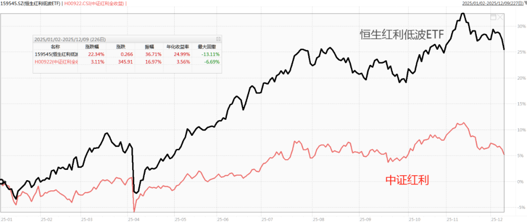 跟踪的基金有恒生红利低波ETF(159545)等,优势是能涨抗跌。今年以来也有22.34%的收益率,大幅跑赢中证红利。(截至2025-12-9)