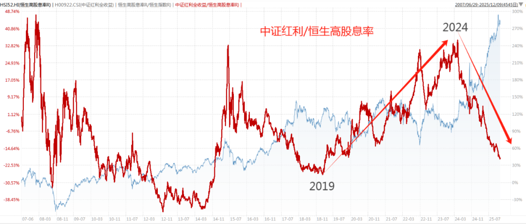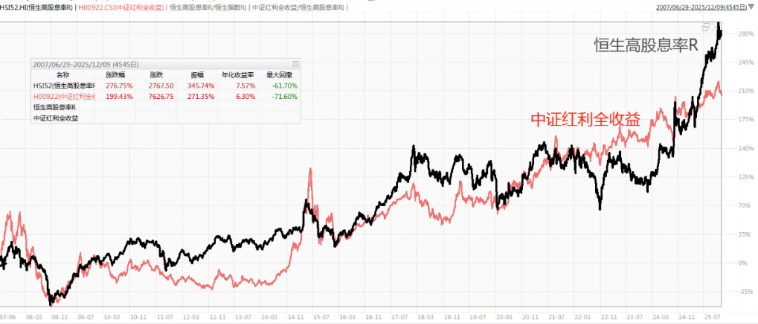 下图是中证红利/恒生高股息率的走势,可以看到,2014年港股通开通以来,两者轮动的趋势是比较明显的:2019-2024是A股红利跑赢,而2024年以来走势持续向下,代表港股红利持续跑赢。(2007-6-29至2025-12-9,数据来源:Wind)