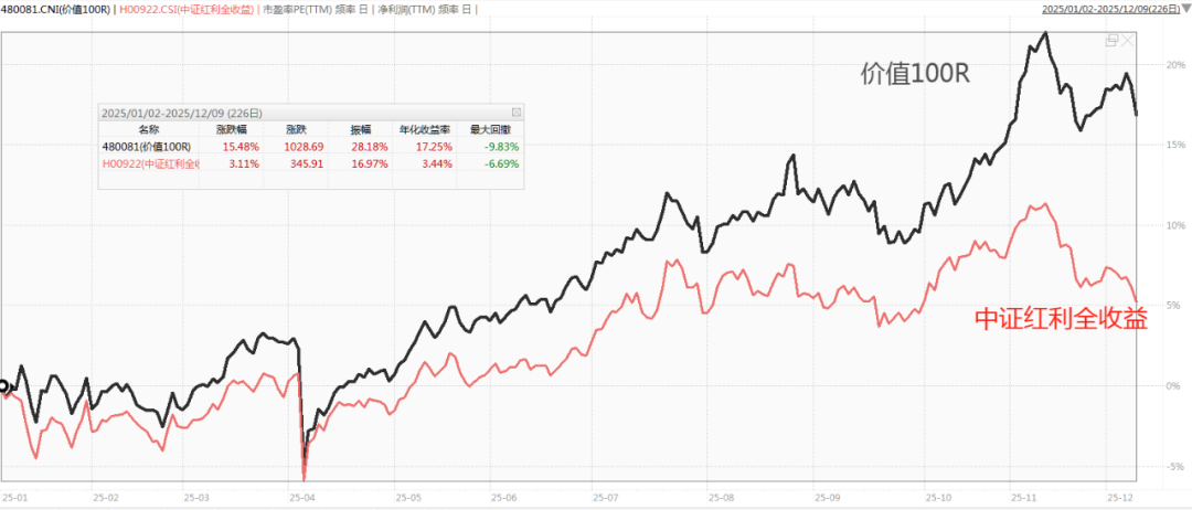 今年经济也越来越呈现出企稳复苏迹象,股市中,价值100指数的表现也好于红利指数。(截至2025-12-9,数据来源:Wind)
