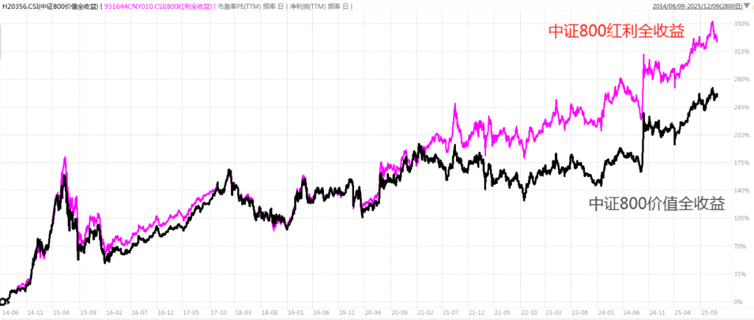 下图可见,中证800价值和中证800红利的走势也比较像,并且呈现出你追我赶的趋势。(2014-6-9至2025-12-8,数据来源:Wind)