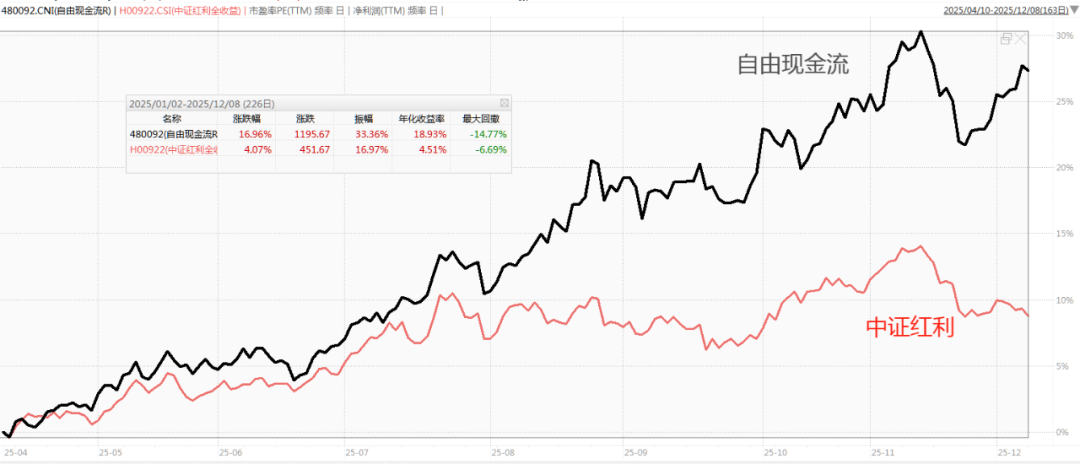 在今年的行情中,市场风险偏好回升,自由现金流指数的表现好于红利指数。不过建议投资者以3~5年以上持有周期看待,规避短期博弈思维。(截至2025-12-9,数据来源:Wind)
