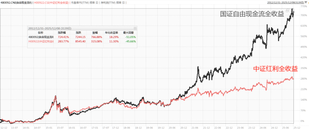 因此现金流指数和红利类指数的走势也比较像,特别是近几年,这两个指数依旧在屡创新高,在它们身上都看不出A股经历过一轮熊市。(2012-12-31至2025-12-8,数据来源:Wind)