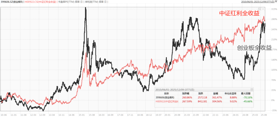下图为中证红利和创业板指的走势对比。(自创业板基日2010-6-1至2025-12-9,数据来源:Wind)