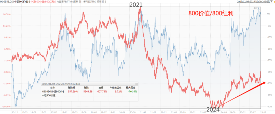 下图为近10年800价值/800红利的走势,可以看到在2021-2023,是红利指数更强,而从2024年开始,价值风格已经强于红利风格了。