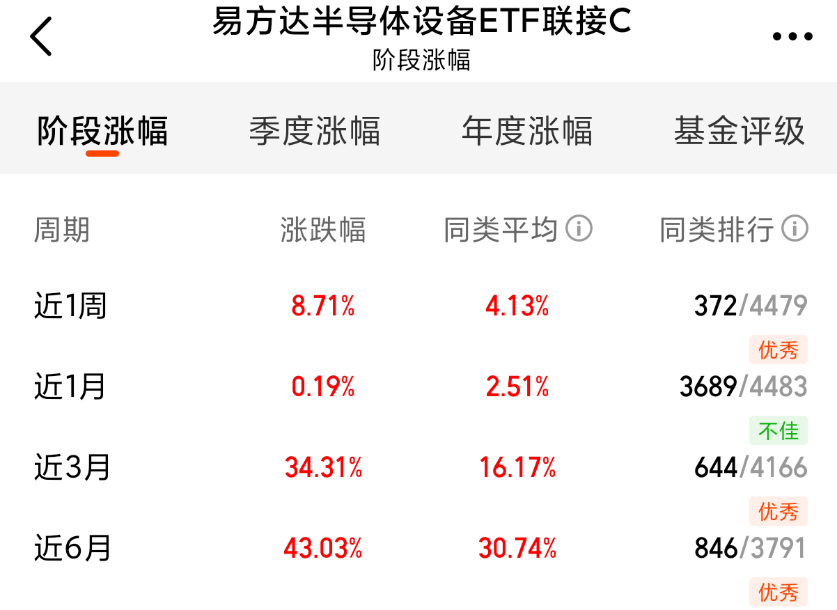 看了一下,$易方达半导体设备ETF联接C(OTCFUND|021894)$追踪布局半导体材料设备主题指数的表现,比其他芯片类指数更聚焦材料设备,更适配近期的市场,因此涨幅更大,今年来上涨了48.35%,收益表现也是强于同类的半导体基金。基金的费率便宜,误差小,是不错的布局半导体材料设备方向的工具。