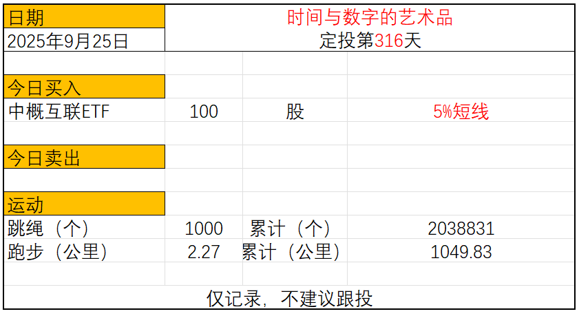 运动与投资第316天2025年9月25日今日定投:中概互联ETF买入100股跳绳